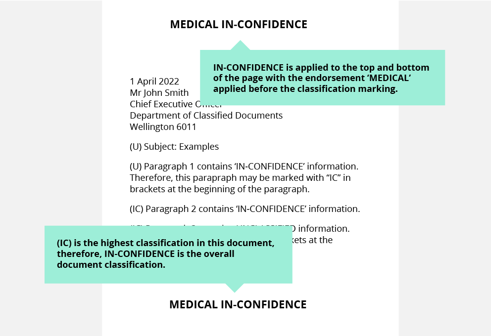When protectively marking documents, the highest security classification should be clearly marked in bold at the centre top and bottom of each page in a single line as shown in Example 3.